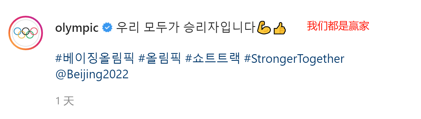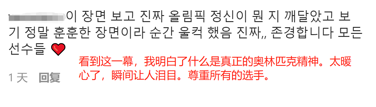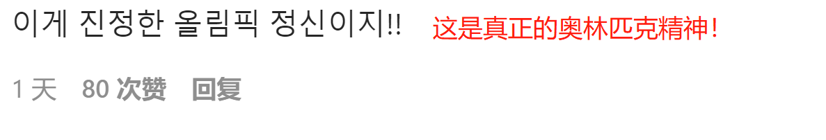 照片发布后,很快就收获了2万多个点赞。韩国网友纷纷留言称赞,有网友写道,“看到这一幕,我明白了什么是真正的奥林匹克精神。太暖心了,瞬间让人泪目。尊重所有的选手。”