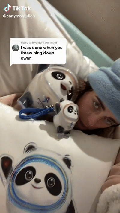 美国滑雪运动员卡莉·马古利斯(Carly Margulies)14日在抖音国际版(TikTok)分享了一段视频,画面中的她被各种冰墩墩的周边包围,包括冰墩墩抱枕,还有两只不同大小的冰墩墩玩偶,她还写道“我非常爱它”。