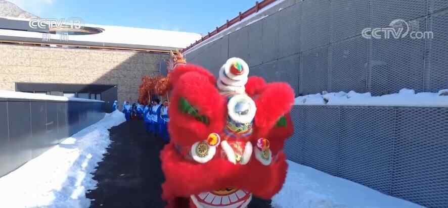 一大早,延庆冬奥村响起锣鼓声,志愿者们分成两组,舞龙舞狮闹元宵。