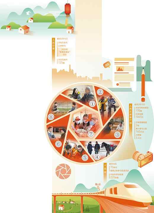 图①至图⑧依次为本报重庆分社记者常碧罗(左)、青海分社记者贾丰丰(右)、湖南分社记者王云娜(右)、内蒙古分社记者吴勇(左)、福建分社记者刘晓宇(左)、浙江分社记者窦瀚洋(左)、广西分社记者祝佳祺(中)及人民网记者冯亚涛(左)在春节期间深入基层采访。