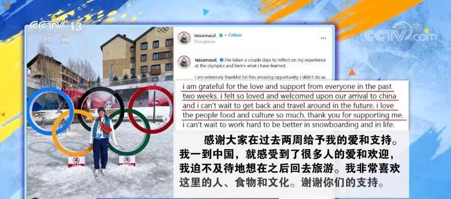 被志愿者那句“欢迎来到中国”而感动落泪的美国单板滑雪运动员特莎·莫德结束比赛后已经回到了美国。她在社交媒体上发文说,花了几天时间来回顾自己在冬奥会上的经历。特莎说,感谢大家在过去两周给予我的爱和支持。我一到中国,就感受到了很多人的爱和欢迎,我迫不及待地想在之后回去旅游。我非常喜欢这里的人、食物和文化,谢谢你们的支持。