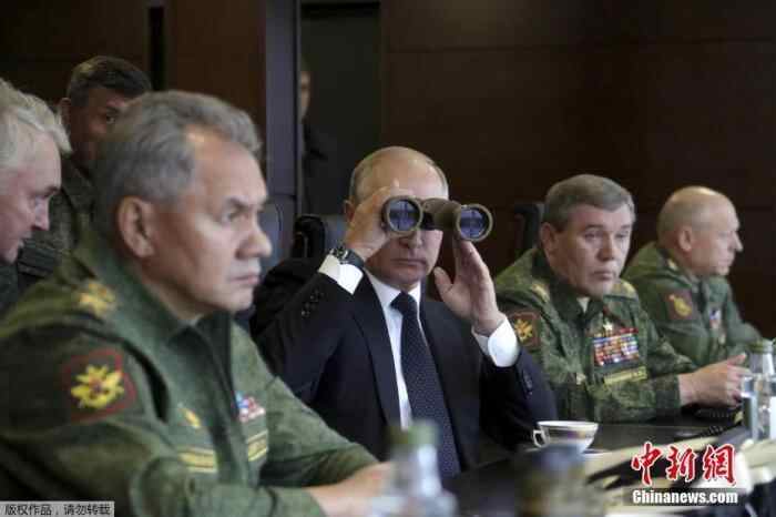 资料图:俄罗斯总统普京用望远镜观看军事演习。