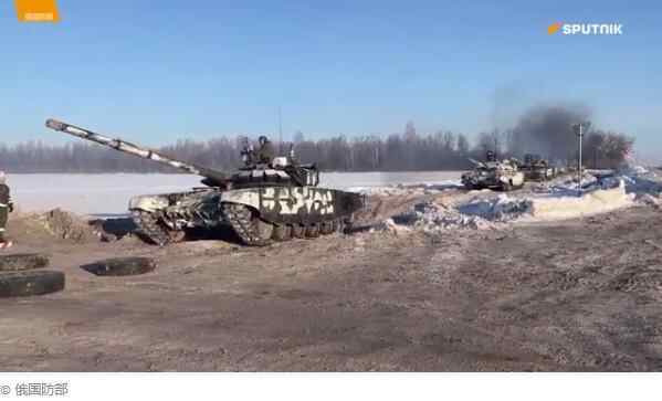 俄罗斯军队坦克纵队结束演习,返回驻地。图片来源:俄罗斯国防部视频截图