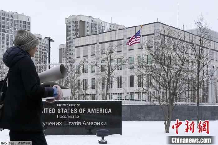 1月24日,乌克兰基辅,一名女子路过美国驻乌克兰大使馆。