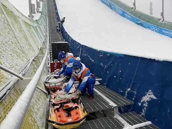 赛道边上设置的马道(镂空楼梯)是给造雪塑形及维修人员预留的,但是赛时,起跳台侧面马道有几位穿着带有红十字橙色背心的人一直站在那里,他们的身边还摆放着医用担架。站在那个位置,只能看到运动员起跳瞬间的背面,翻转、抓板、落地那些最精彩的部分一概看不见。运动员表现的好吗?下一位参赛运动员是谁?分数多少?他们只能通过现场的音响、观众的呼喊声听到。“因为运动员有可能在赛道中间受伤,所以除了结束区,我们必须在起跳台周边安排医疗保障人员。这样才能实现我们的承诺。”场馆团队医疗经理高晖介绍说。他们在赛场边要做的是:2分钟,将患者运至场地外;4分钟,评估伤情完毕,启动转诊流程,将患者转往定点医院;15分钟,患者抵达定点医院救治……还有这样一群人,当大家目不转睛看着精彩赛事,他们却在场馆的各个“角落”,做着自己的事。