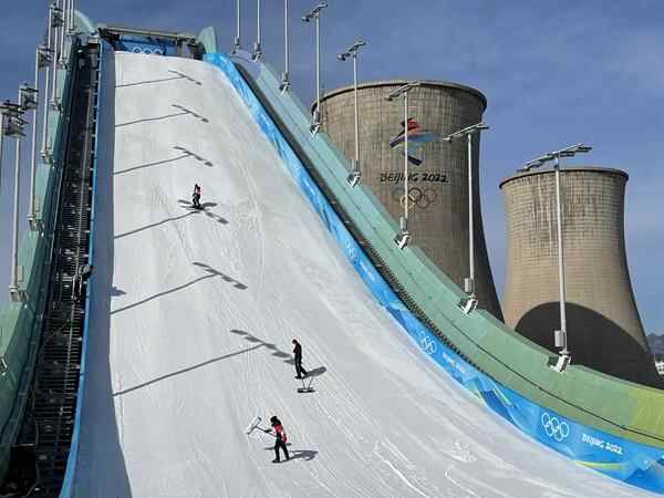 为了这条赛道,大跳台工作人员从2021年12月12日起,就开启了“造雪工程”,七台造雪枪和四台造雪炮同时“轰鸣”,通过智能化造雪系统,一方面满足出发区、助滑坡、起跳区和着陆坡对于雪量和雪质的不同要求,另一方面不断提高造雪效率,确保节能环保。与其他雪上场馆不同,首钢滑雪大跳台是唯一座落在城区的,由于北京城区白天气温高、降温晚、寒潮短,所以只有在深夜至凌晨才能达到造雪的要求。为保证如期完成造雪任务,以山地运行经理韩冬为首,刘麒、魏巍重点配合的14人造雪团队时时监测气候及风向条件及时启动设备,每隔一小时进行一次实地查看,以便最大效率地进行造雪。数个通宵的工作,最终完成赛道造雪面积约4190平方米,造雪总量达11500立方米,储雪3600立方米,为赛道塑形打好坚实基础。
