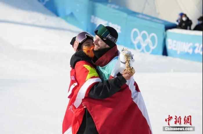 图为苏翊鸣(左)与马克斯·帕罗特拥抱。中新社记者 毛建军 摄