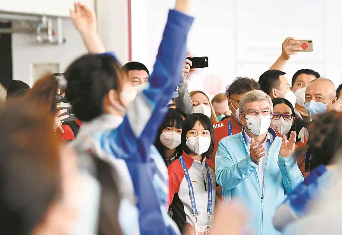 2月18日,国际奥委会主席巴赫来到北京2022年冬奥会主媒体中心,与志愿者交流互动,巴赫对北京冬奥会的组织工作给予了高度评价 图/新华社