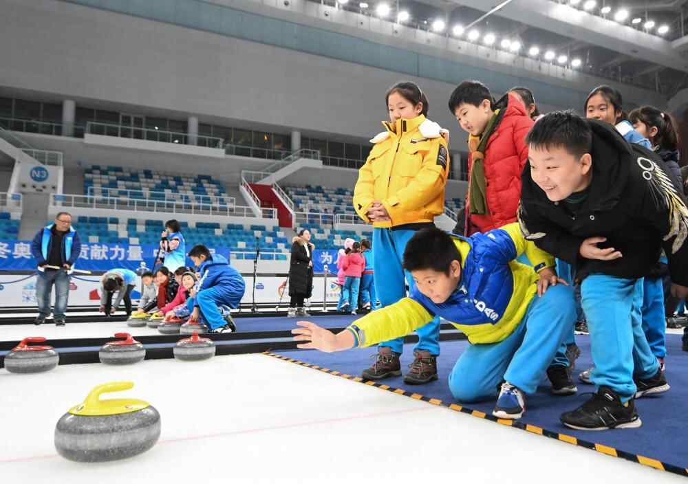 2019年12月10日,北京史家实验学校的学生在“冰立方”体验冰壶。新华社记者 鞠焕宗 摄