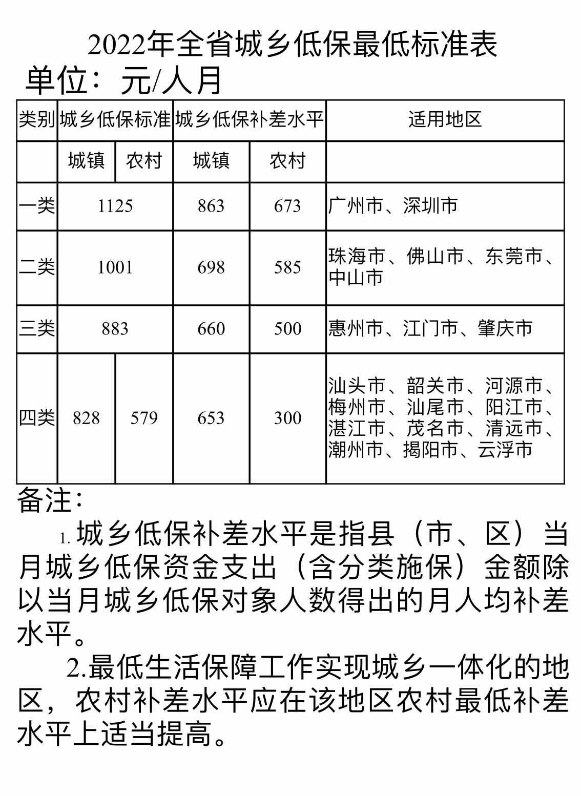 其中,广州、深圳等一类地区城乡低保最低标准为1125元/人月,珠海、佛山、东莞、中山等二类地区为1001元/人月,惠州、江门、肇庆等三类地区为883元/人月,汕头、韶关、河源等四类地区城镇为828元/人月、农村为579元/人月。