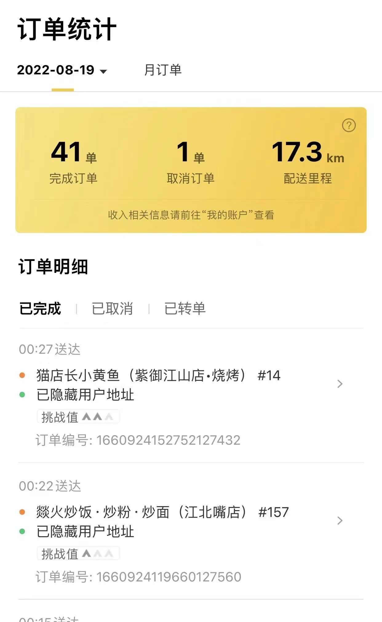 从2022年8月7日正式接单以来,他最多一天送了41单外卖,平台的月统计显示,他8月收入3353.5元。
