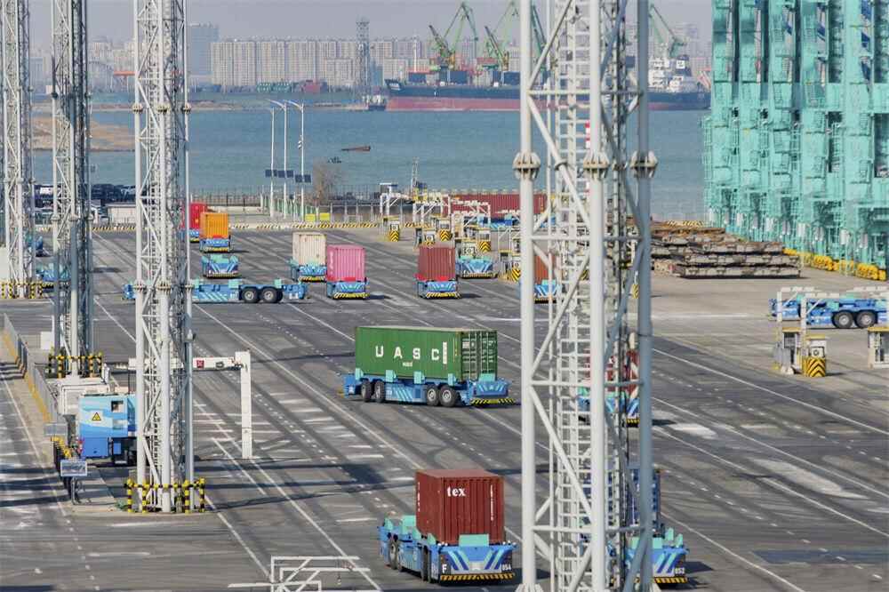 智能水平运输机器人在天津港全物联网集装箱码头作业(2月21日摄)。新华社记者 张铖 摄