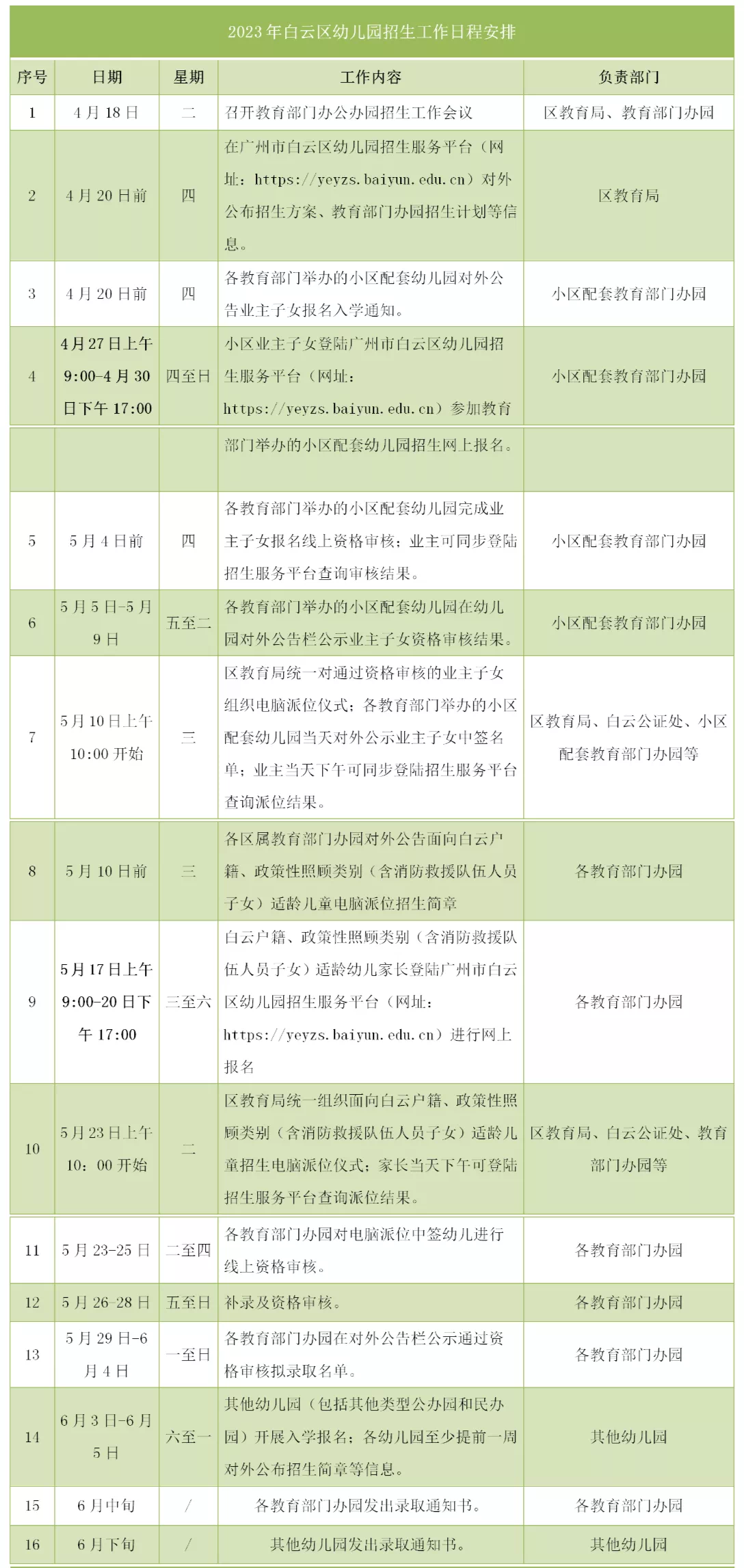 近日,广州市白云区教育局发布关于做好2023年幼儿园招生工作的通知。根据通知,教育部门举办的小区配套幼儿园,业主子女网上报名时间为4月27日至4月30日。详情如下: