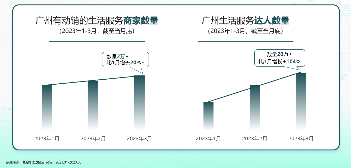 繁荣的线上传播、活跃的线下的用户、发达的夜经济,无一不透露着广州旺盛的消费需求。随着抖音平台对生活服务的布局,越来越多的商家和达人也陆续入场。从数据来看,2023年3月抖音上有动销的生活服务商家数量超过2万,比1月增长了20%;抖音生活服务达人数量超过20万,比1月增长了104%,商家和达人都表现出欣欣向荣的迹象。