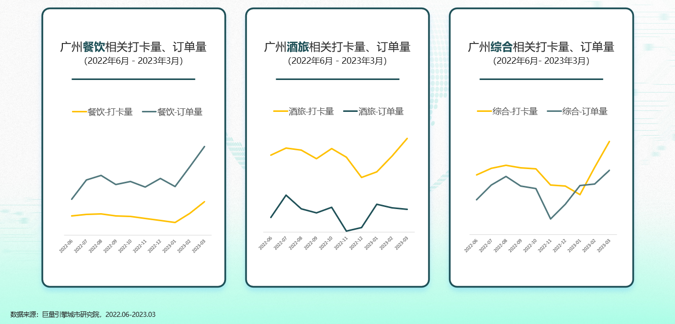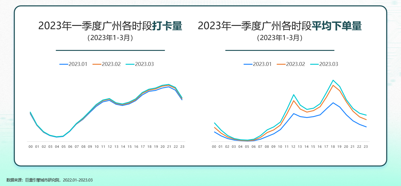 从各时段的下单量看,广州在中午12:00左右和晚上18:00左右有两个下单量高峰,尤其是晚高峰作为广州用户夜生活的开端,可持续2-3个小时,下单量也达全天最高。无论是打卡量还是下单量,3月份的数据相较于1月都有显著的增长,这也显示了广州夜经济逐渐复苏的迹象。