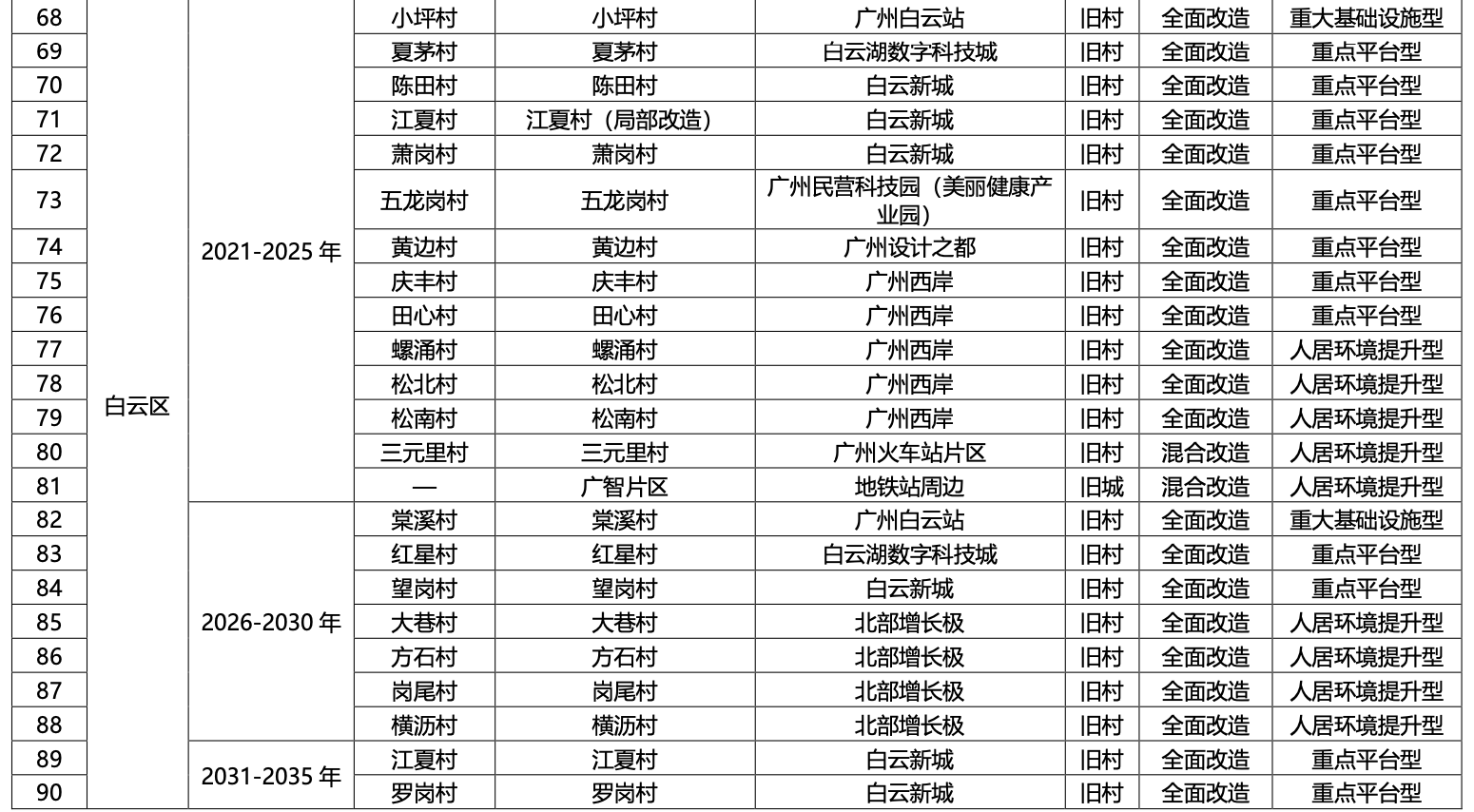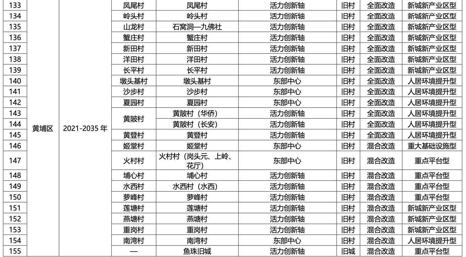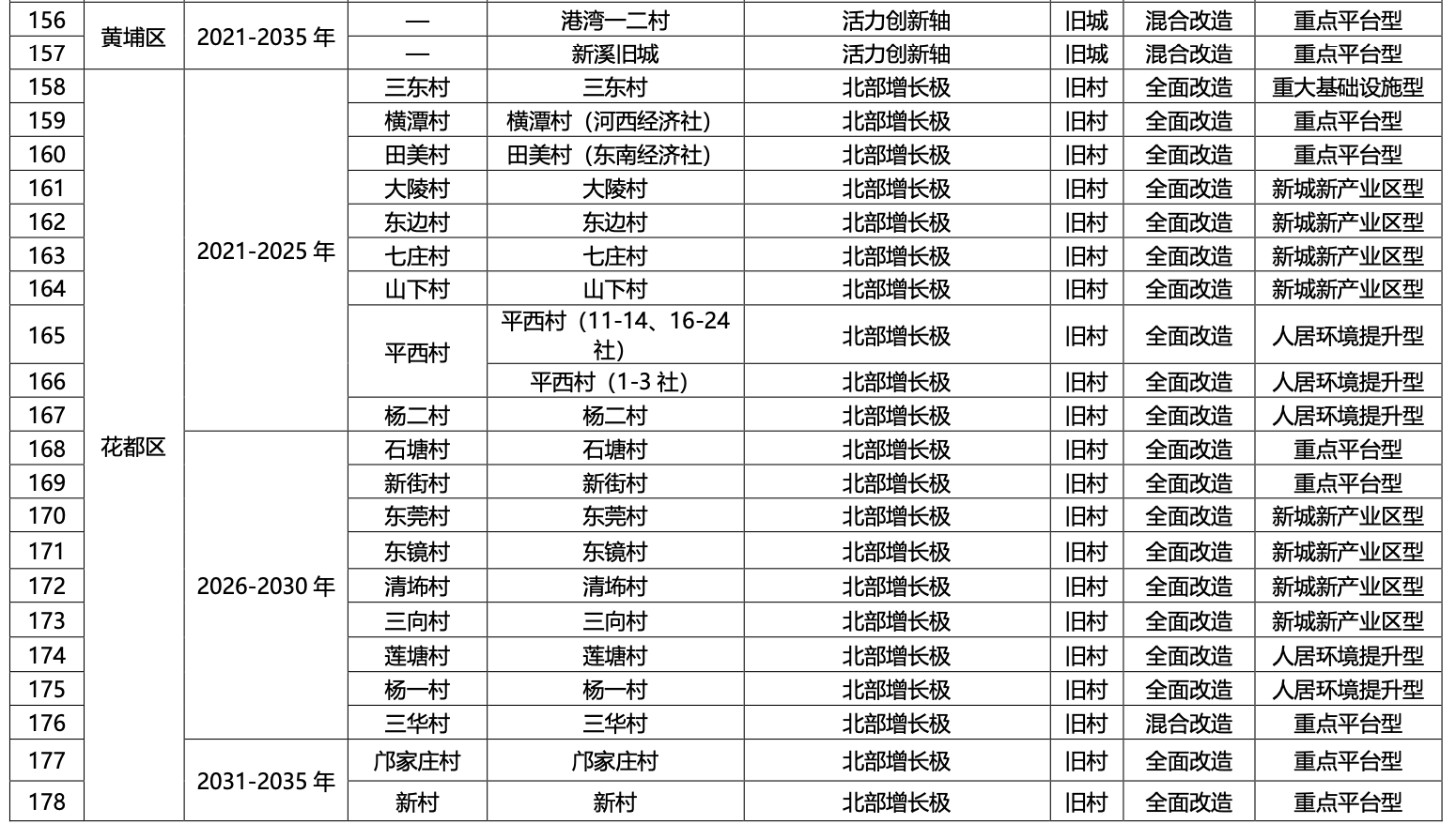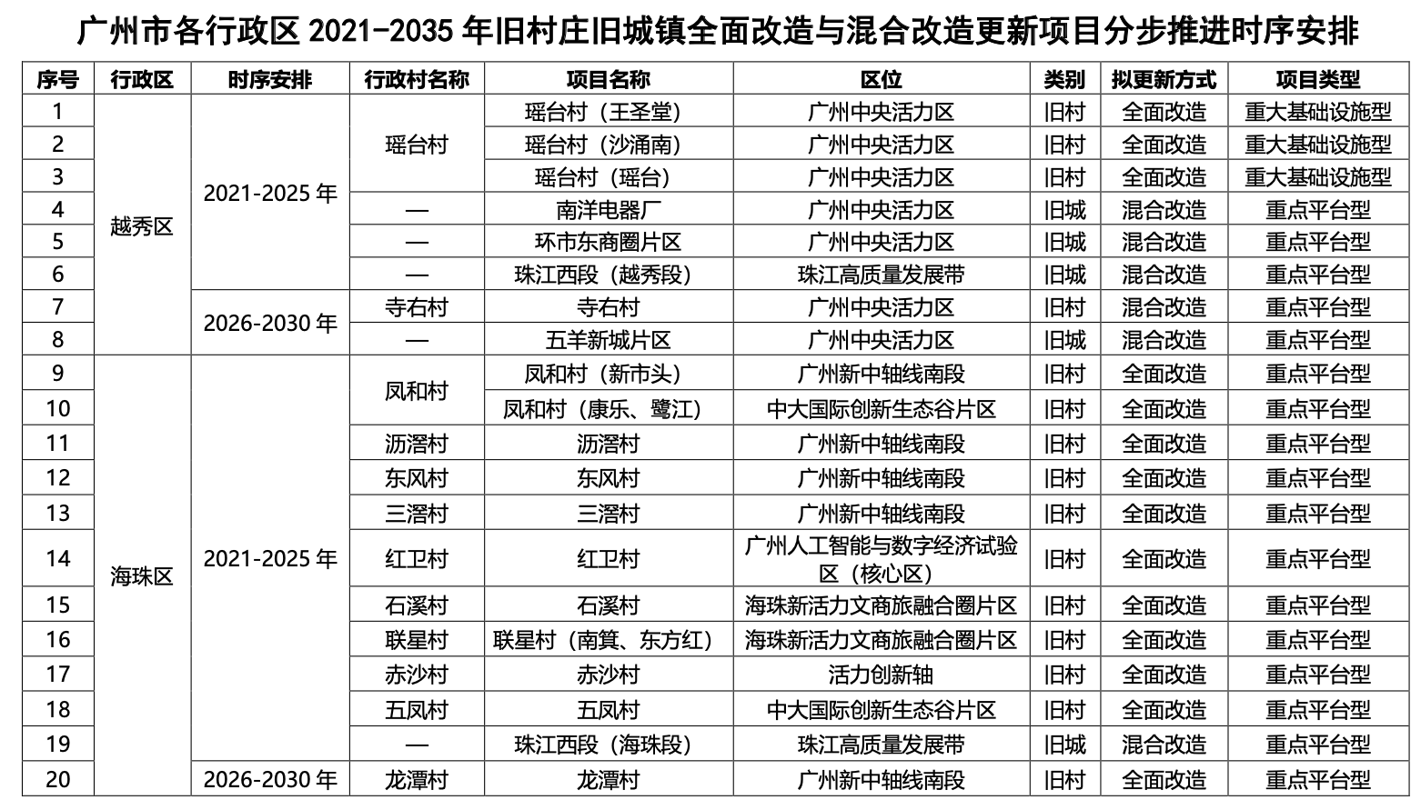 一、广州市各行政区2021-2035 年旧村庄旧城镇全面改造与混合改造更新项目分步推进时序安排表