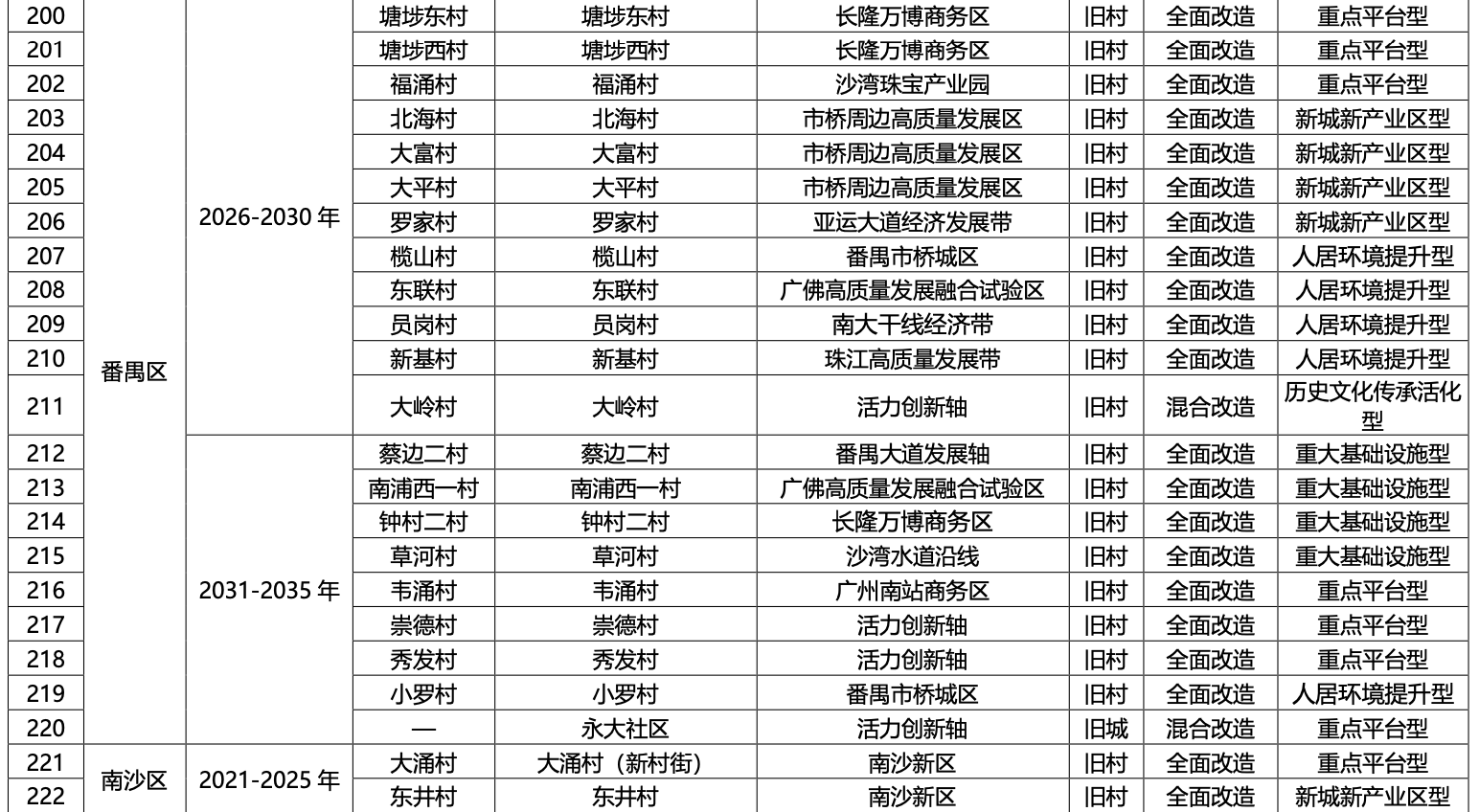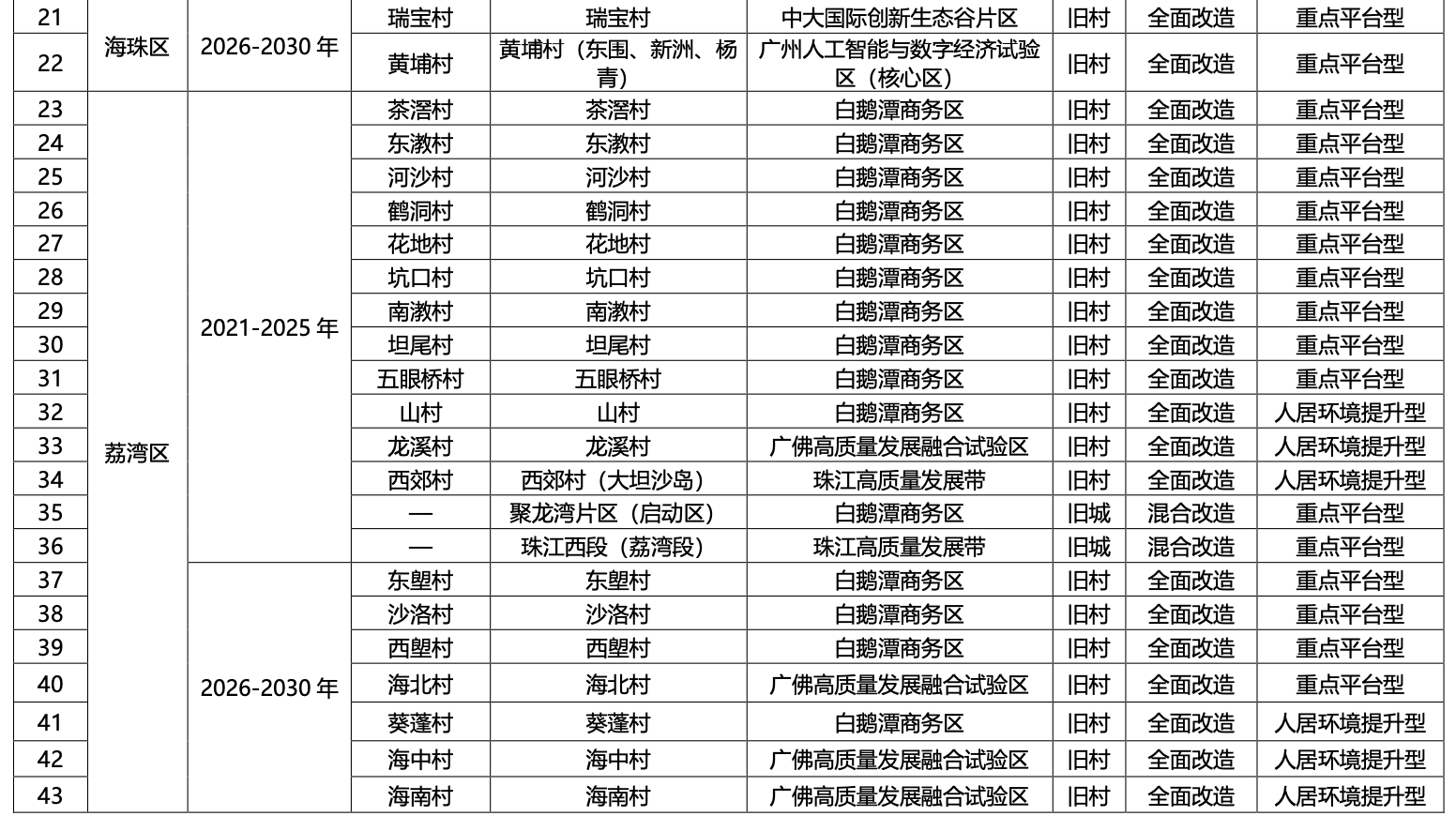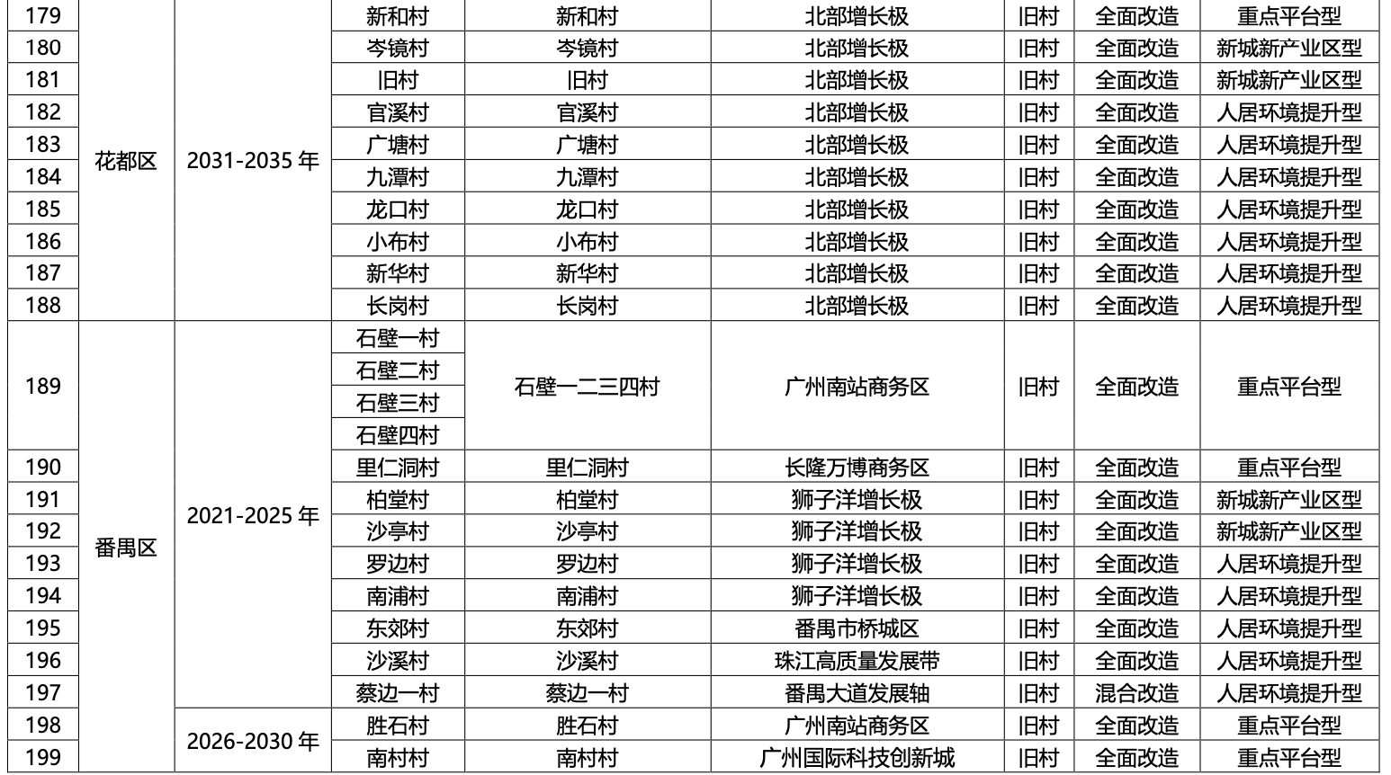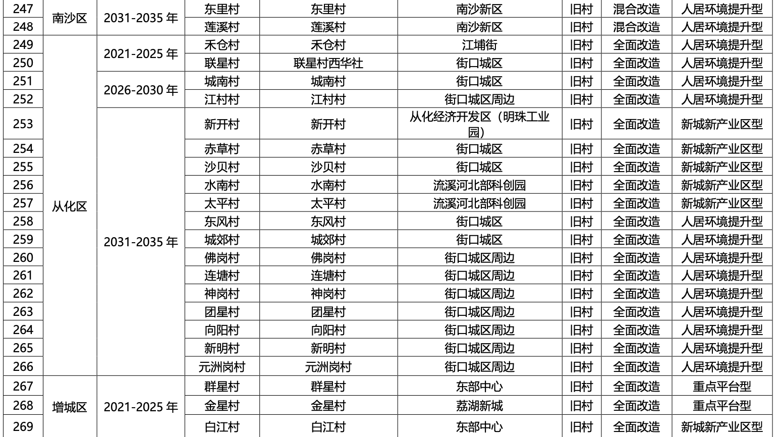 一、广州市各行政区2021-2035 年旧村庄旧城镇全面改造与混合改造更新项目分步推进时序安排表