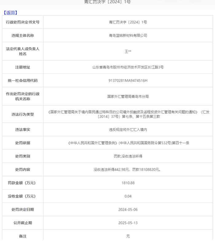 青汇罚决字〔2024〕2号罚单显示,青岛兴信昌新材料科技有限公司(简称兴信昌)因违反规定将外汇汇入境内,违反了《国家外汇管理局关于境内居民通过特殊目的公司境外投融资及返程投资外汇管理有关问题的通知》(汇发〔2014〕37号)第七条、第十五条第三款。由此,该局对涉事公司作出上述处罚。