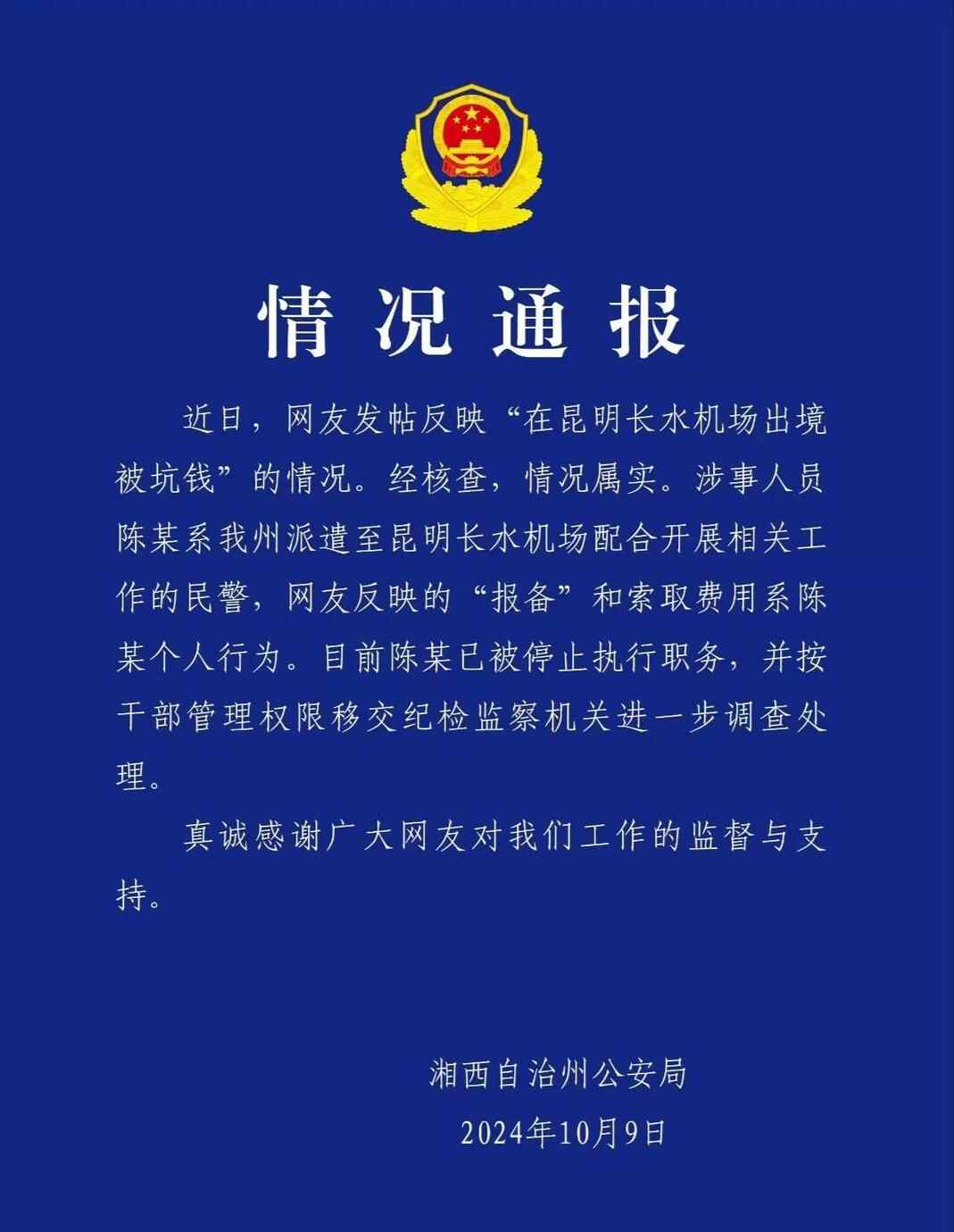 9日,湖南湘西自治州公安局发布通报称,该情况属实,涉事人员陈某系该州派遣至昆明长水机场配合开展相关工作的民警,网友反映的“报备”和索取费用系陈某个人行为。目前陈某已被停止执行职务,并按干部管理权限移交纪检监察机关进一步调查处理。