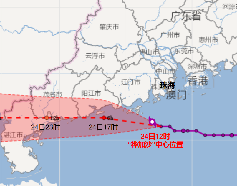 预计未来24小时内“桦加沙”将以每小时20公里左右的速度向西偏北方向移动,台风外眼已抵达珠三角地区,将于24日下午到夜间在台山到湛江之间沿海登陆。