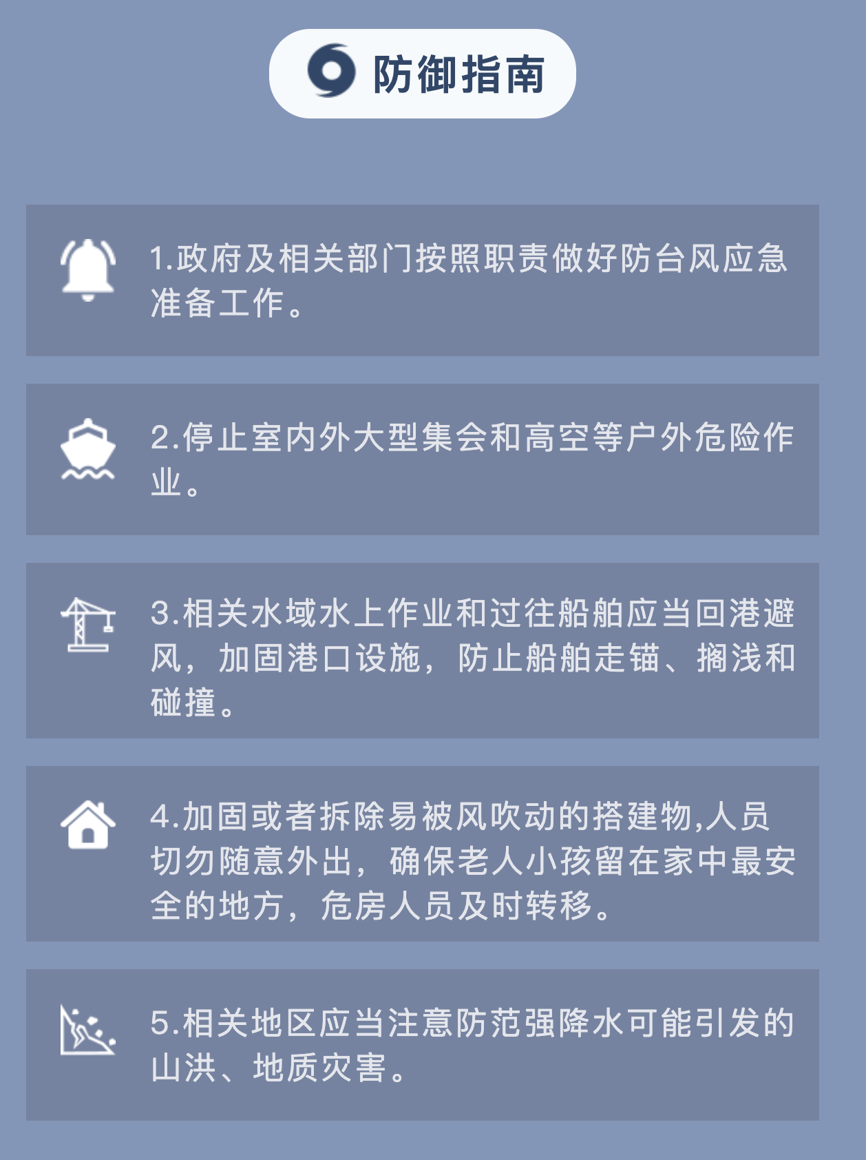 渔业船舶、海上(水上)施工暂不恢复作业,具体时间由主管部门另行通知。居住在低洼地带、山体边坡、危旧房屋等危险区域的已转移人员,要积极配合政府部门管理,做到“不安全、不返回”。