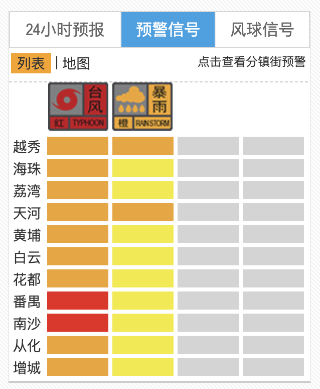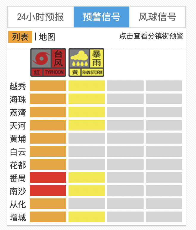截至9月24日13时30分,广州全市所有行政区,全部发布台风和暴雨预警信号。其中越秀、天河将暴雨预警信号升级至橙色,其余各区维持暴雨黄色预警。番禺、南沙两区维持台风红色预警信号,其余各区维持台风橙色预警信号。