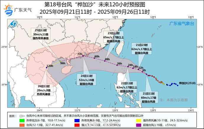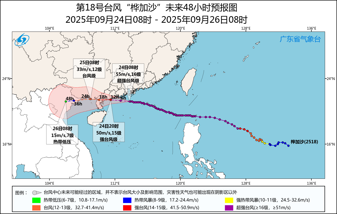 今年第18号台风“桦加沙”已于9月21日上午加强为超强台风级,并将于23日凌晨进入南海东北部,逐渐向广东中西部至海南岛东北部一带沿海靠近,受其影响,广东东部沿海将有7-9级大风,阵风可达10-11级,广东地区将出现暴雨或大暴雨,局部地区有特大暴雨。