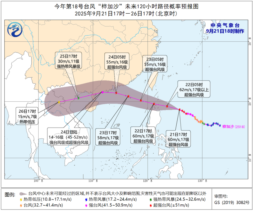 今年第18号台风“桦加沙”(超强台风级)22日8时位于菲律宾马尼拉北偏东方向约570公里的洋面上,中心附近最大风力17级以上(62米/秒),以每小时20~25公里左右的速度向偏西方向移动,将于23日凌晨进入南海东北部海面。