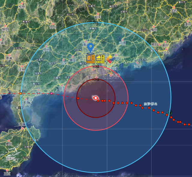 从台风路径图看,目前台风“桦加沙”正趋向粤西方向,10级风圈基本覆盖珠海、中山、江门、阳江的多个市县,同时12级风圈继续扩大到珠海、江门、阳江等地的南部沿海。