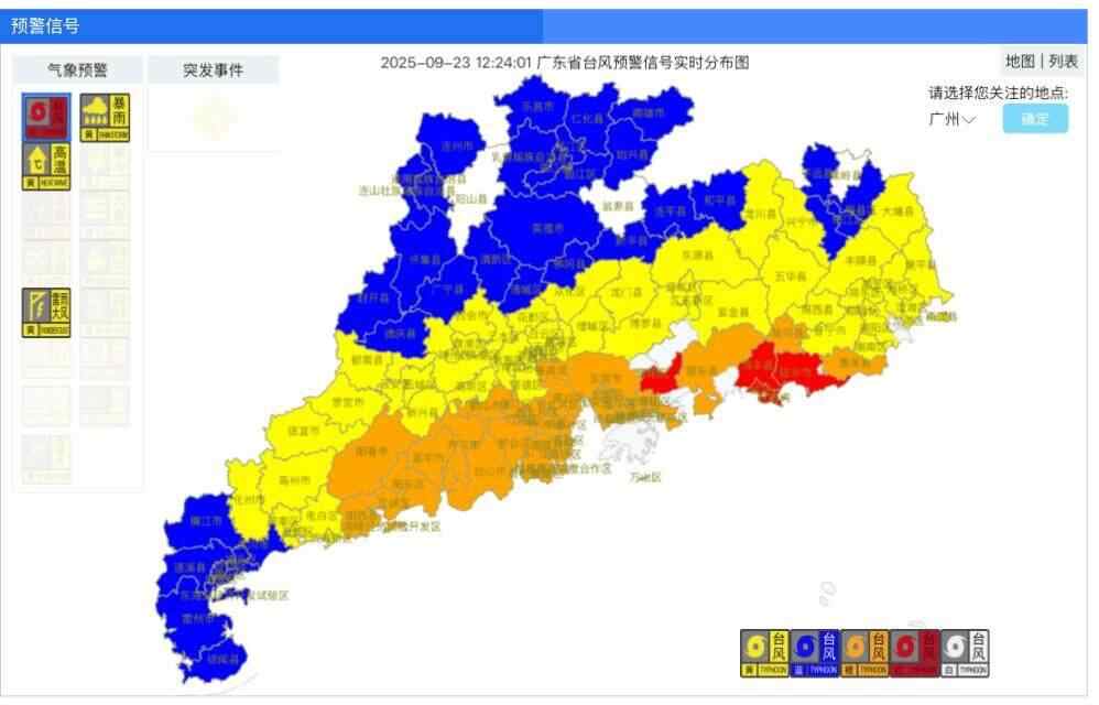 9月24日13时45分更新:广州全市发布台风加暴雨预警越秀天河升级暴雨橙色预警