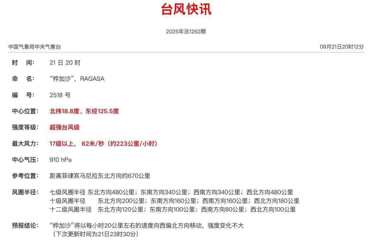 根据中央气象台观测,今年第18号台风“桦加沙”,截至9月21日17时继续维持超强台风强度,但风圈半径持续扩大。从21日午后起,广东多地已陆续发布针对“桦加沙”的台风预警信号。