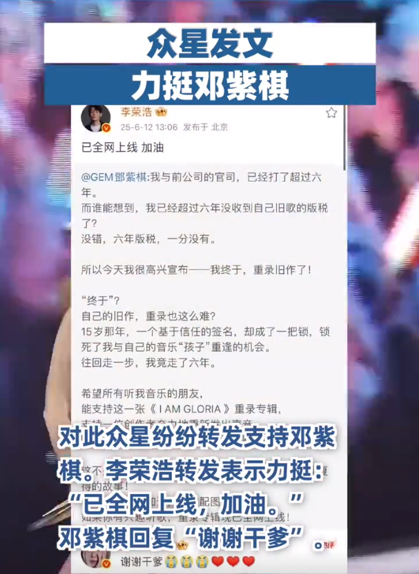 6月12日,邓紫棋在微博发文控诉与前公司的版权纠纷,宣布重录专辑《I AM GLORIA》全网上线,引发娱乐圈广泛支持。邓紫棋自15岁签约前公司时因全英文合约条款埋下隐患,未成年时期签署的合约导致其创作的《泡沫》《光年之外》等热门歌曲著作权归属前公司。