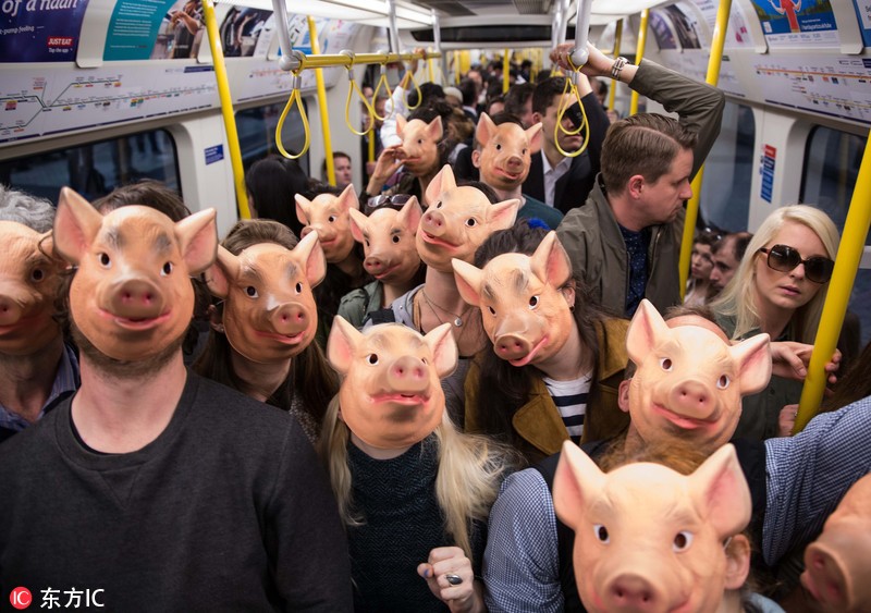 当地时间2016年5月13日,英国伦敦,动物慈善组织机构' Farms Not Factories'向市民发起“竖起你的鼻子”( TurnYourNoseUp)运动,呼吁民众关注猪农场的饲养环境,和呼吁停止猪集约型生产方式。ZCVA/东方IC