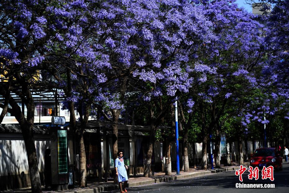 5月5日,蓝花楹花海里的机动车流。据悉,蓝花楹于1984年首次由中科院昆明植物研究所从阿尔及利亚引进昆明,该景观树高大优美,在昆明适应性良好,每年的春末初夏盛放,花期只有10至20天左右。