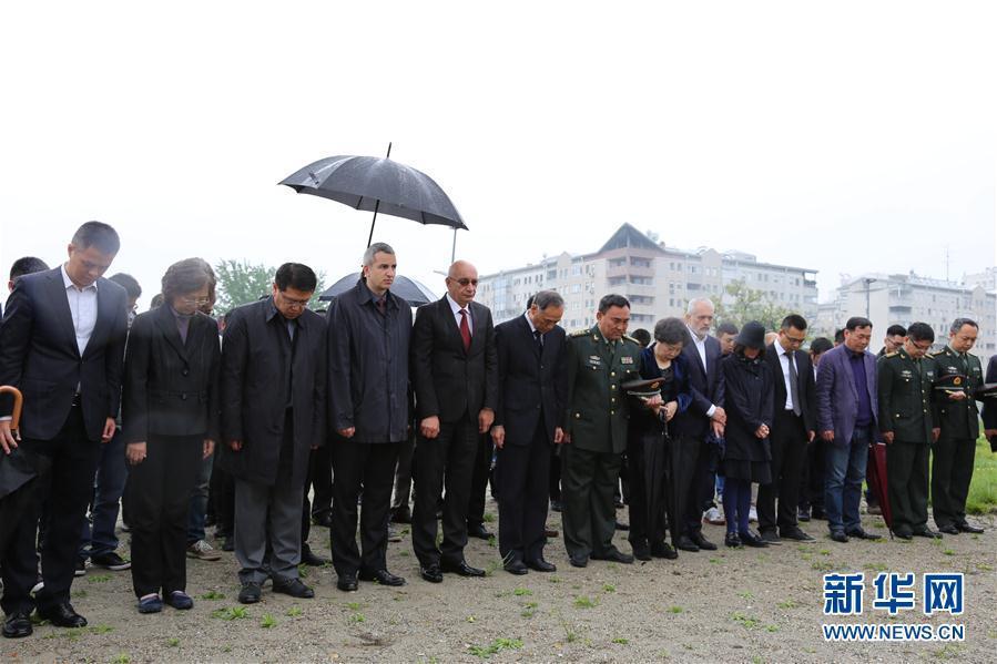 5月7日,在塞尔维亚贝尔格莱德,中国驻塞使馆工作人员、塞政府代表等在中国驻南斯拉夫联盟大使馆旧址纪念牌前默哀。图片来源:新华网新华社记者王慧娟摄