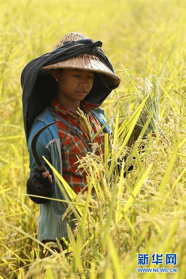 5月13日,在缅甸内比都,农民在田里收割水稻。缅甸是亚洲主要的稻米出口国之一。 新华社/欧新