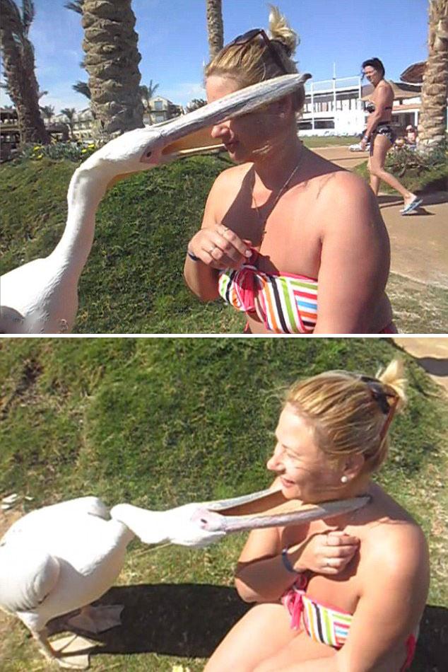 2015年3月消息,近日一段鹈鹕啃食女游客的视频在网上热传,该视频录制于埃及度假酒店,一位女游客在喂鹈鹕吃香蕉的时候,被其啃食头部、脖子、手臂等部位,看来它是饿坏了。