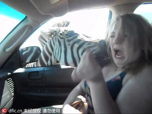 美国德克萨斯州,游客Megan和朋友一起旅行希望和动物能够亲密接触,路上斑马突然袭击了她,希望能抢到她正在吃的薯片,不料竟然咬到了Megan的肩膀,好在伤势很轻。Whitehotpix/东方IC