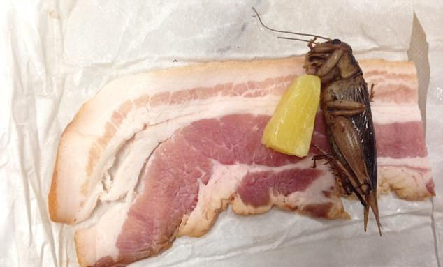 大蚂蚱。赛迪曾帮助一位厨师制作过一道法式开胃小菜,即加工一些蚂蚱让它们看起来更有食欲。通过3个小时的努力,她将做好的蚂蚱摆放在事先装好培根和菠萝的盘子中,然后开吃。当吃到蚂蚱的那一刻,她听到刺啦刺啦的声音,嘴巴里满是发霉的味道,恶心至极。