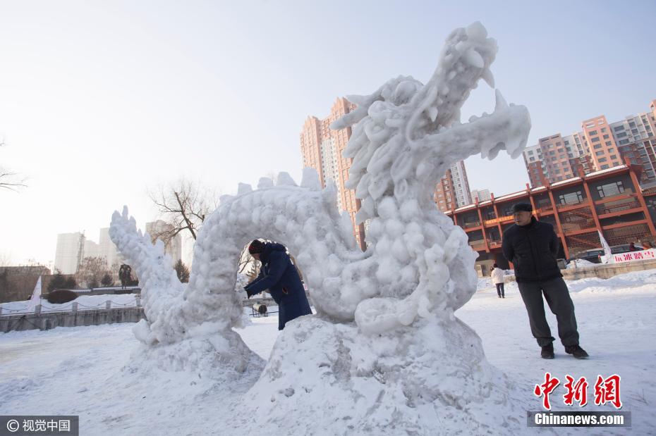 冬天还能做点什么,当然是堆雪人,啊不,是堆雪龙!吉林省吉林市跃马湖上,这个霸气的雪塑是退休教师刘庆武用一个月时间创作的。“我已经连续5个冬天制作雪塑冰雕了,作为新年礼物,2017年做的最多,已经完成了9个。” 朱万昌 摄 图片来源:视觉中国