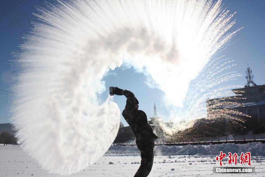 都知道东北的冬天冷,那么冷到什么程度?图中这名新兵在训练之余,玩起了泼水成冰的游戏,就不用小编多说了吧。 中新社发 李广福摄