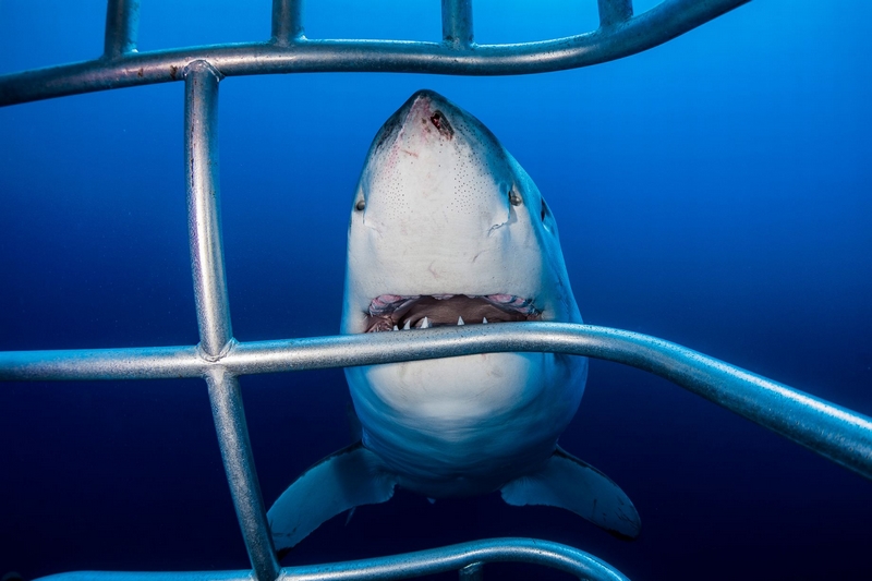 瓜达卢佩岛是世界上八大鲨鱼笼潜水胜地之一,游客穿戴好潜水装备,钻进一个小型“铁笼子”里,就可以深入海底,以从未体验过的方式近距离观察大白鲨了。达维德正是此次潜水的一员,而这次机会也让他有幸得以用相机记录下“海中霸王”的凶猛和静美。