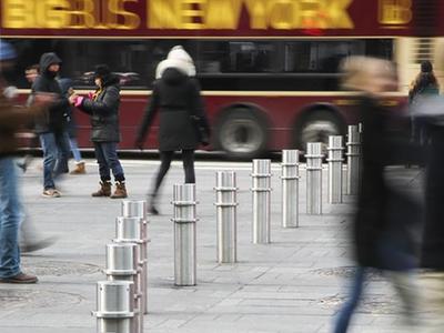 1月3日,在美国纽约时报广场,行人从金属隔离桩之间走过。新华社记者王迎摄