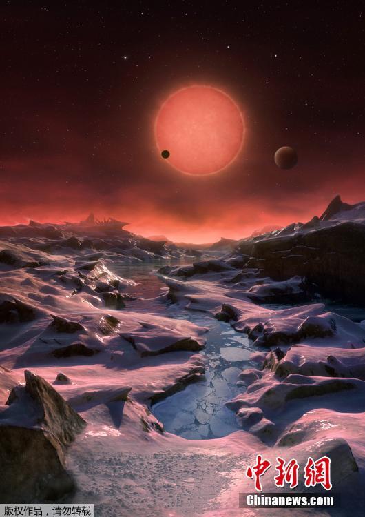 “Trappist-1d”和“Trappist-1e”是Trappist-1行星系中最受注目的两颗小行星,科学家初步判断可能是合适人类寓居的类地势星。图为电脑绘制合成图片。