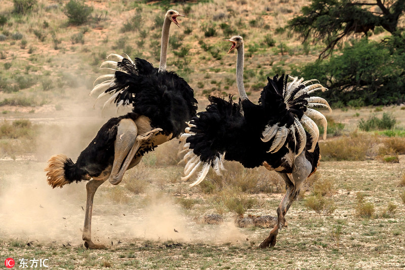 2017年2月28日报道,58岁的摄影师Charlie Lynam和摄像师Emma Franklin在卡拉哈迪国家公园旅行时,拍摄到了两只鸵鸟对决的惊险场面。一只雄性鸵鸟试图欺凌10只小鸵鸟,被小鸵鸟们的爸爸看见,并立即冲出来保护自己的孩子,两只雄性鸵鸟很快进入打斗场面。最终,鸵鸟爸爸不仅把入侵者打得掉毛,还扬起了阵阵灰尘,这只鸵鸟入侵者最后狼狈的逃走了。东方IC