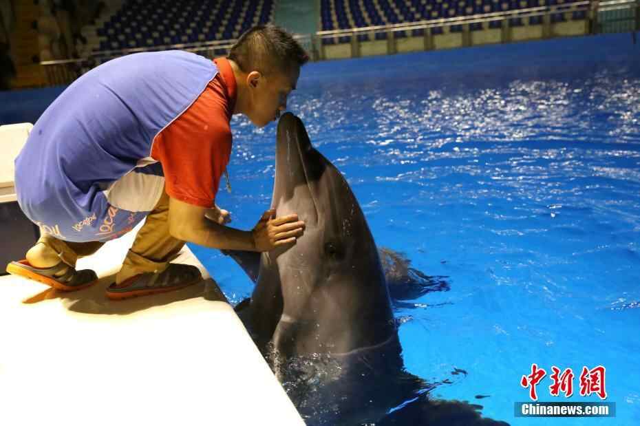 徐阳龙和海豚相处已有3年多的时间,对海豚的习性非常了解,可以和它们一起亲密接触。图为徐阳龙和海豚。王成杰 摄