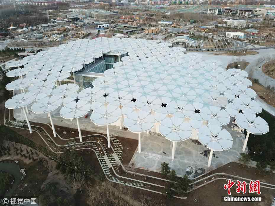 3月31日,北京,航拍世园会场馆。2019年中国北京世界园艺博览会是经国际园艺生产者协会批准、国际展览局认可,由中国政府主办、北京市承办的最高级别的世界园艺博览会,于2019年4月29日至2019年10月7日在中国北京市延庆区举行的世界园艺博览会,展期162天。梁爽 摄 图片来源:视觉中国