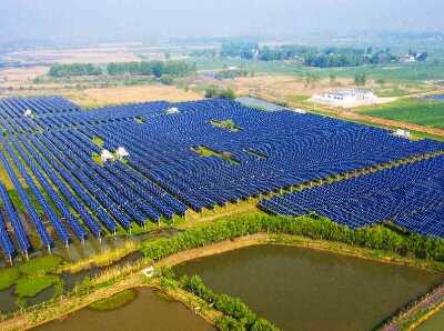 航拍安徽省固镇县王庄镇“渔光互补”项目。新华网发(李向前 摄)