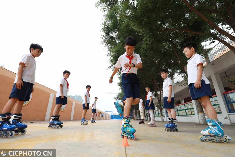↑6月28日,河北省内丘县新西关小学学生在参加轮滑社团活动。CICPHOTO/石晓鹏 摄