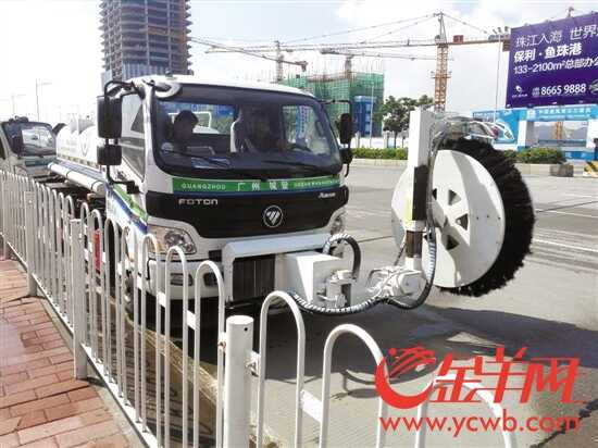 除了各种“扫街机器”,就连马路中间的护栏和地面的口香糖,也有专门的机器负责“应对”。胡昌峰表示,马路中间的护栏,有专门的高压清洗圆盘对其进行清洗。地面口香糖有专门的口香糖清洁机,该机器通过高温高压蒸汽可以实现三秒清理一块口香糖。目前天河区已有2台,未来计划购置二三十台。
